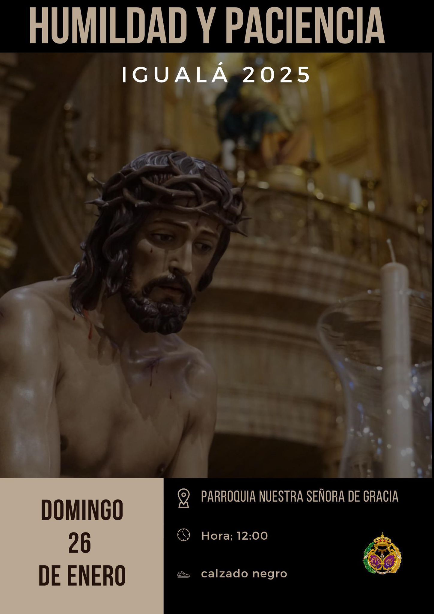 Informamos que nuestro IV Via Crucis tendrá lugar el viernes 4 de abril , en lugar del día 7 de marzo. Nuestro titular, el Santísimo Cristo de la Humildad y Paciencia, recorrerá las calles colindantes a la parroquia de Nuestra Señora de Gracia aproximadamente a las 20:30h, al término de la Eucaristía. ¡Os esperamos a todos!