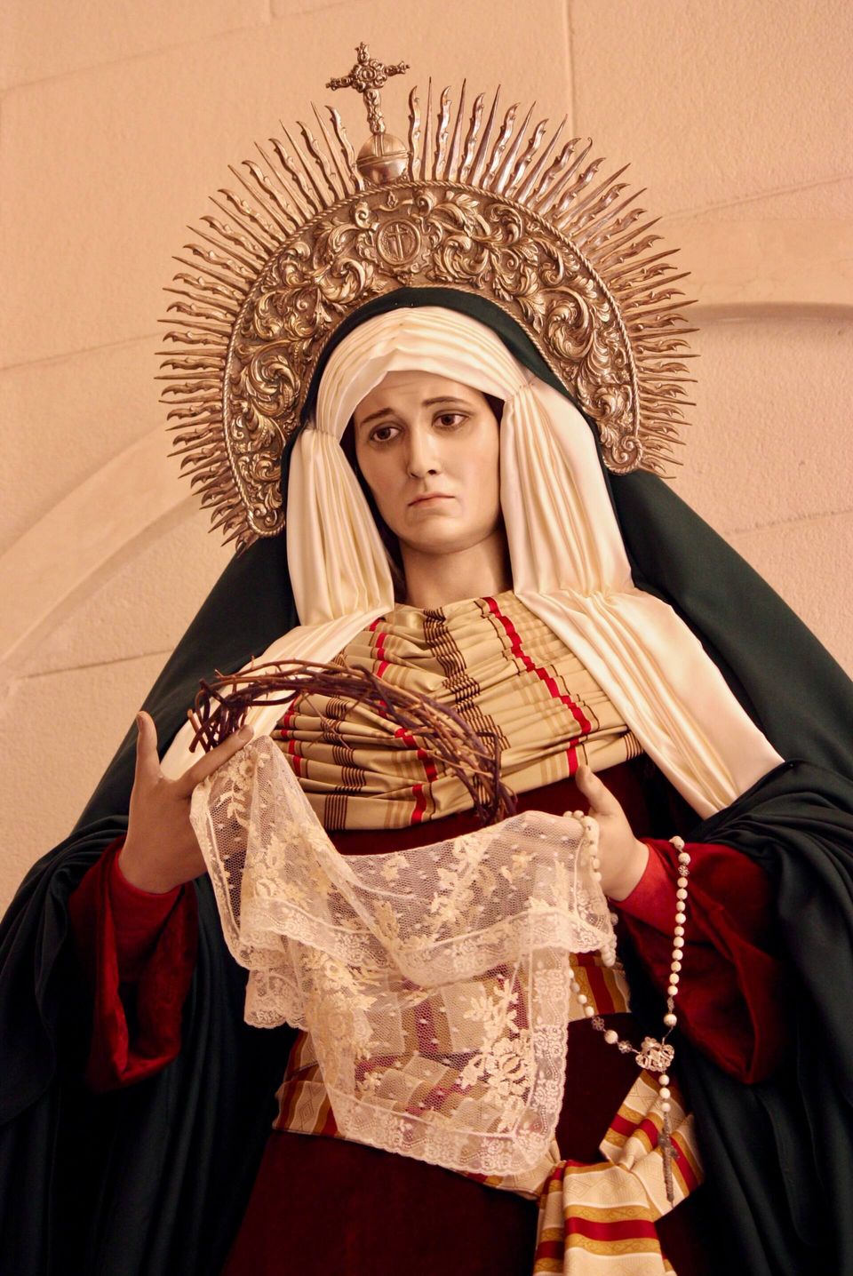 Ntra. Sra. de las Lágrimas, ha sido ataviada para esta cuaresma con el terno de hebrea. Como marcan los cánones, luce la saya de terciopelo burdeos, ceñida a la cintura con fajín rayado. El tocado resuelto en su parte del rastrillo con tela de raso beige y en el pecherín tela de seda rayada. Manto de sarga verde, recogido sobre los brazos. Ciñe sus sienes la diadema que posee la Santísima Virgen en su ajuar. Y en sus manos pañuelo de encaje, corona de espinas y rosario antiguo de plata y nácar.