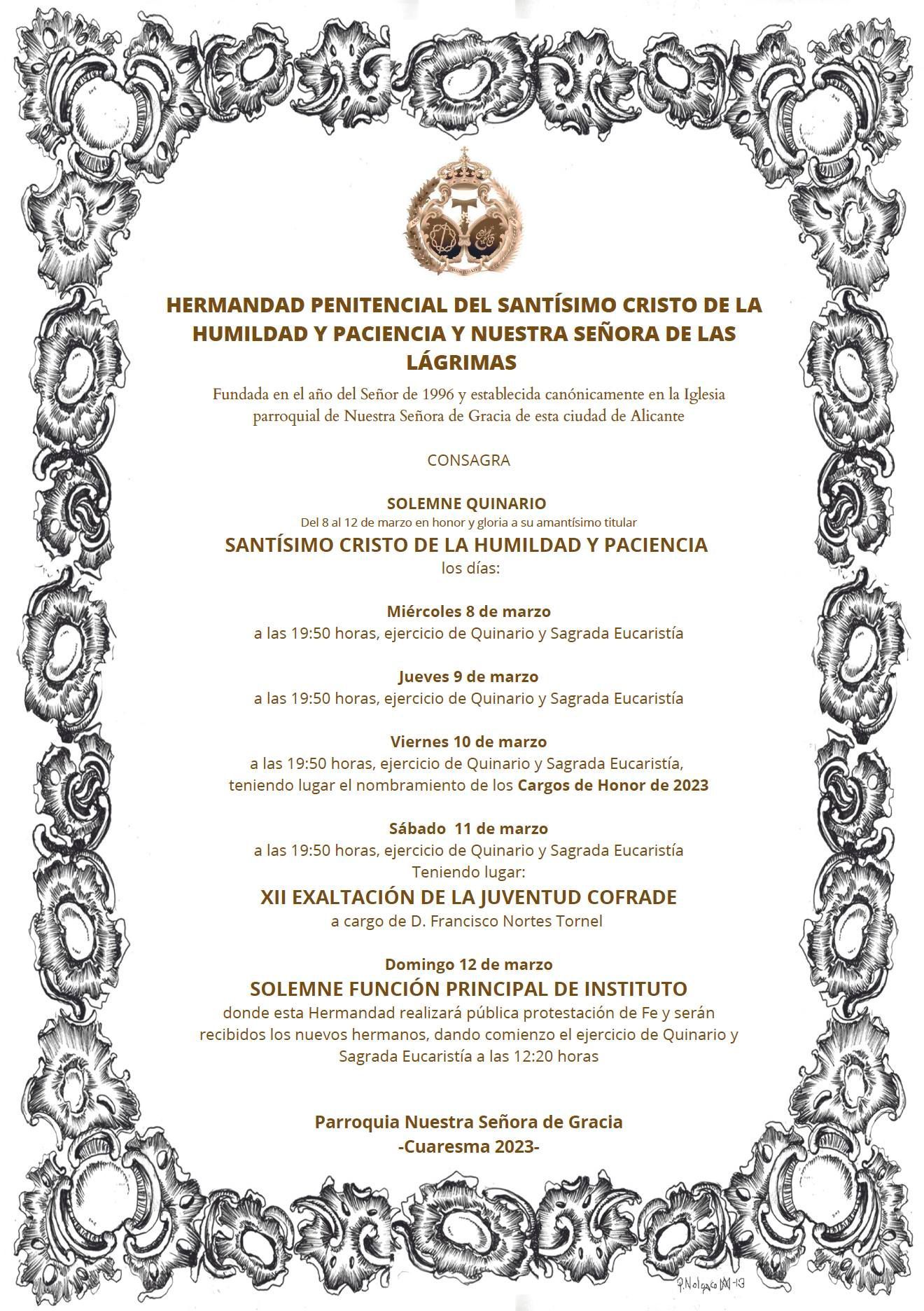 La Hermandad Penitencial del Santísimo Cristo de la Humildad y Paciencia y Nuestra Señora de las Lágrimas, consagra a su venerado Titular el Santísimo Cristo de la Humildad y Paciencia, en el Solemne Quinario del día 8 al 12 de marzo de 2023.