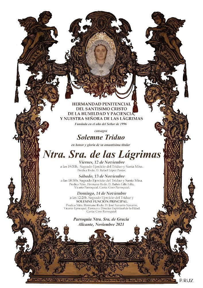 La Hermandad Penitencial del Santísimo Cristo de la Humildad y Paciencia, Nuestra Señora de las Lágrimas y San Francisco de Asís consagra a su venerada Titular la Santísima Virgen de las Lágrimas, en el Solemne Triduo del día 12 al 14 de noviembre de 2021, comenzando cada día con el ejercicio del Quinario y Santa Misa, predicadas por Ntro. Hno. Rvdo. D. Rafael López Pastor, Ntro. Hno. Rvdo. D. Rubén Lillo Lillo y Ntro. Hno. Rvdo. D. José Navarro Navarro., en la Parroquia de Nuestra Señora de Gracia.